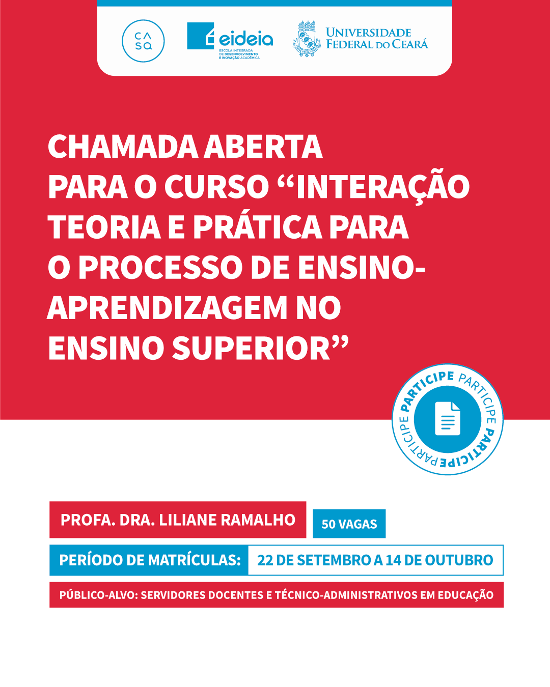 Data da publicação: 22 de setembro de 2025 Categoria: CASa, Cursos, NotíciasA Escola Integrada de Desenvolvimento e Inovação Acadêmica (EIDEIA), por meio da Coordenadoria de Inovação e Desenvolvimento Acadêmico (COIDEA) e do Programa CASa (Comunidade de Cooperação e Aprendizagem Significativa) está lançando o curso “Interação teoria e prática para o processo de ensino e aprendizagem no ensino superior”, com o objetivo de desenvolver competências para a interação teoria e prática no processo de ensino e aprendizagem no ensino superior. O ensino superior deve possibilitar uma formação que envolva o desenvolvimento da autonomia, criticidade e criatividade, preparando, assim, para o trabalho e para a formação pessoal e de caráter amplo.
