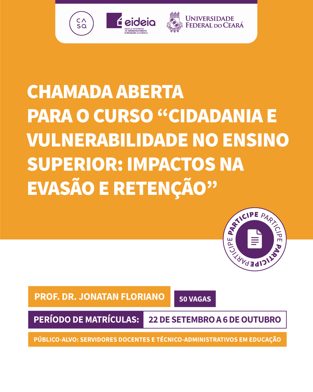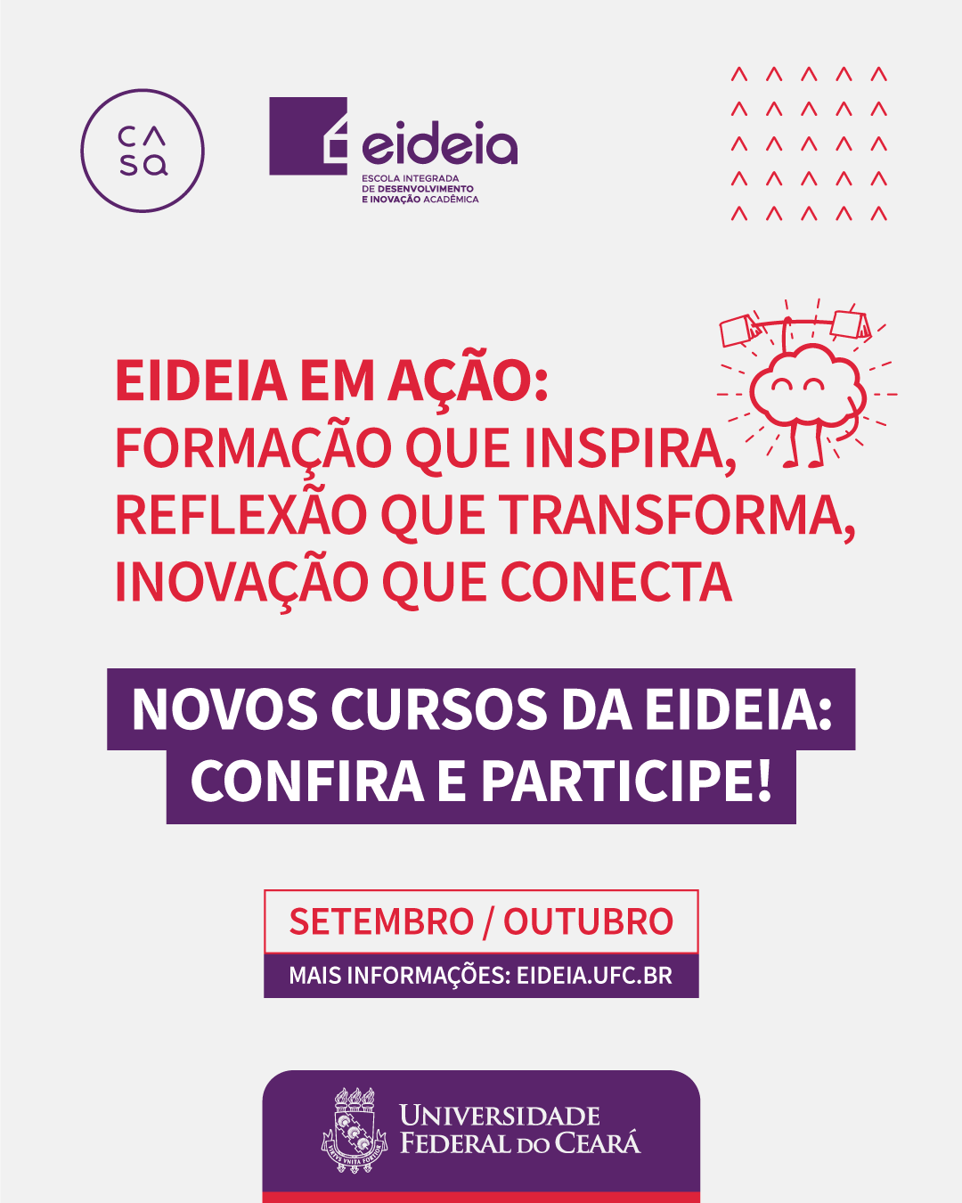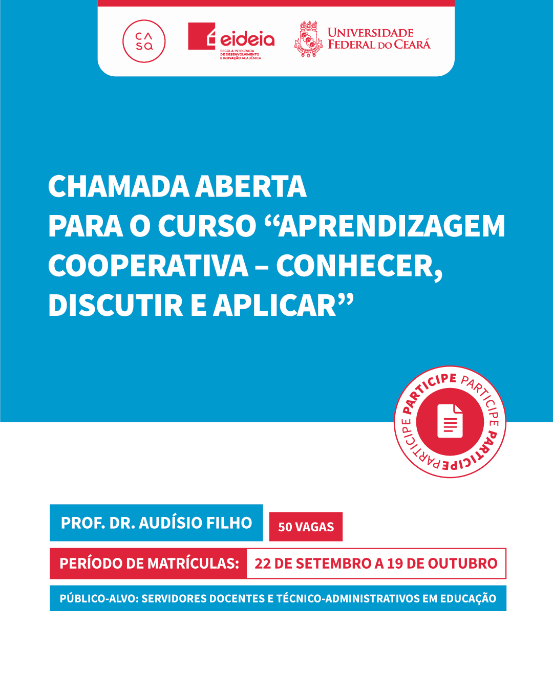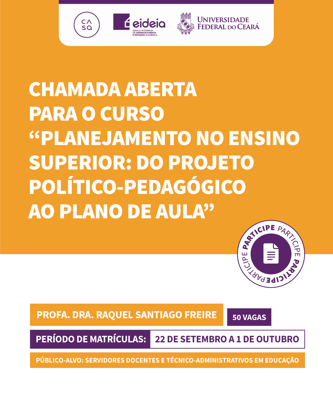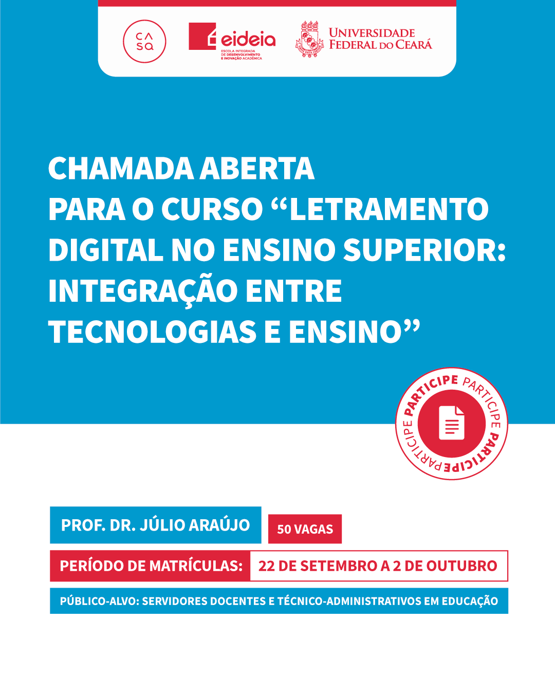 Data da publicação: 22 de setembro de 2025 Categoria: CASa, Cursos, NotíciasA Coordenadoria de Inovação e Desenvolvimento Acadêmico (COIDEA/UFC) abre inscrições para 10 novos cursos de formação docente, destinados a servidores (docentes e técnicos) da Universidade Federal do Ceará.