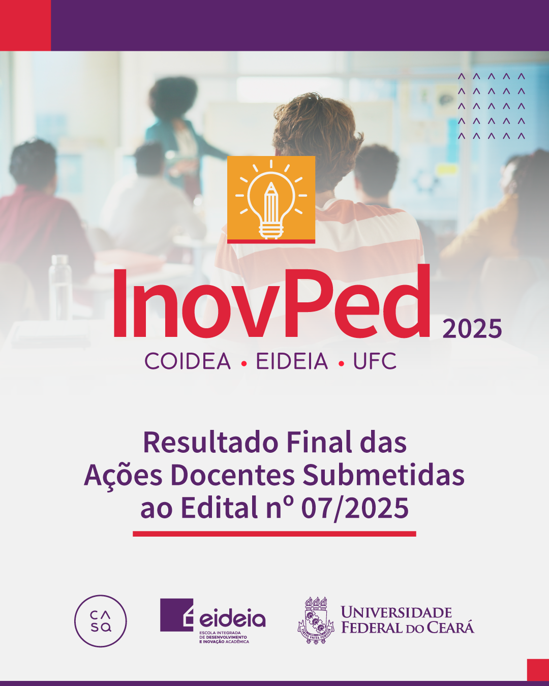 Data da publicação: 1 de dezembro de 2025 Categoria: CASa, Eventos, InovPedA Escola Integrada de Desenvolvimento e Inovação Acadêmica (EIDEIA), por meio da Coordenadoria de Inovação e Desenvolvimento Acadêmico (COIDEA) e do Programa Comunidade de Cooperação e Aprendizagem Significativa (CASa), da Universidade Federal do Ceará (UFC), divulga o resultado final da seleção das ações docentes submetidas à seleção para o InovPed – Edital N° 07/2025.