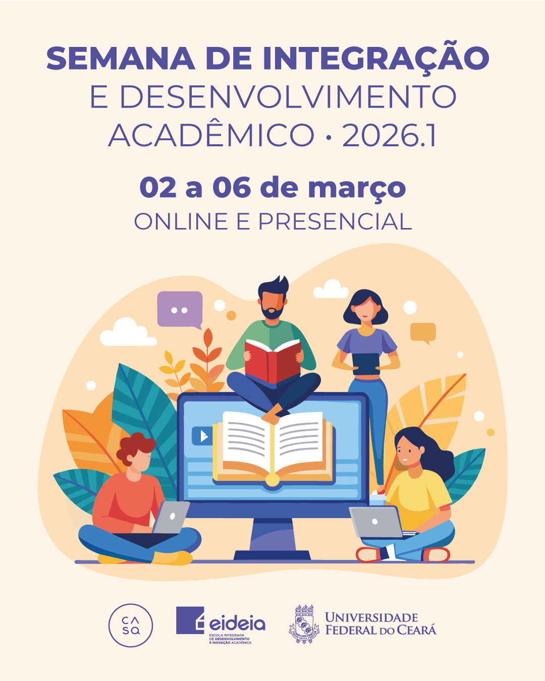 Data da publicação: 20 de fevereiro de 2026 Categoria: CASa, Eventos, Notícias, Semana de Integração e Desenvolvimento AcadêmicoA primeira semana do semestre 2026.1 será marcada pela recepção de estudantes, professores e servidores técnico-administrativos da Universidade Federal do Ceará (UFC). De 2 a 6 de março, ocorre a Semana de Integração e Desenvolvimento Acadêmico, com programação em diferentes auditórios da Universidade, em Fortaleza, e transmissão on-line.